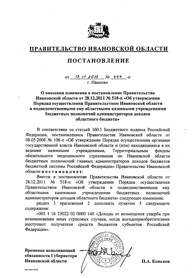 Постановление Правительства Ивановской области от 13.11.2013 N 444-п "О внесении изменения в постановление Правительства Ивановской области от 28.12.2011 N 518-п "Об утверждении Порядка осуществления Правительством Ивановской области и подведомственными ему областными казенными учреждениями бюджетных полномочий администраторов доходов областного бюджета"