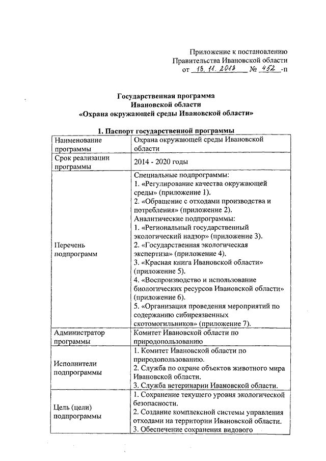 Постановление Правительства Ивановской области от 13.11.2013 N 452-п "Об утверждении государственной программы Ивановской области "Охрана окружающей среды Ивановской области"