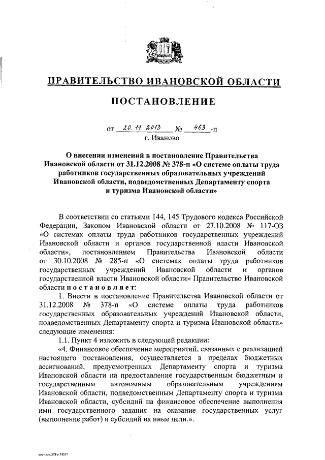 Постановление Правительства Ивановской области от 20.11.2013 N 463-п "О внесении изменений в постановление Правительства Ивановской области от 31.12.2008 N 378-п "О системе оплаты труда работников государственных образовательных учреждений Ивановской области, подведомственных Департаменту спорта и туризма Ивановской области"