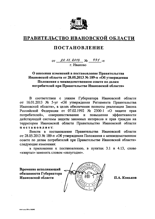 Постановление Правительства Ивановской области от 20.11.2013 N 471-п "О внесении изменений в постановление Правительства Ивановской области от 28.05.2013 N 189-п "Об утверждении Положения о межведомственном совете по делам потребителей при Правительстве Ивановской области"