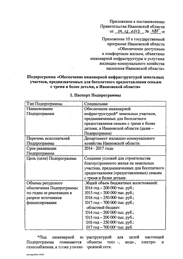 Постановление Правительства Ивановской области от 04.12.2013 N 485-п "О внесении изменения в постановление Правительства Ивановской области от 13.11.2013 N 458-п "Об утверждении государственной программы Ивановской области "Обеспечение доступным и комфортным жильем, объектами инженерной инфраструктуры и услугами жилищно-коммунального хозяйства населения Ивановской области" (вместе с "Подпрограммой "Обеспечение инженерной инфраструктурой земельных участков, предназначенных для бесплатного предоставления семьям с тремя и более детьми, в Ивановской области")