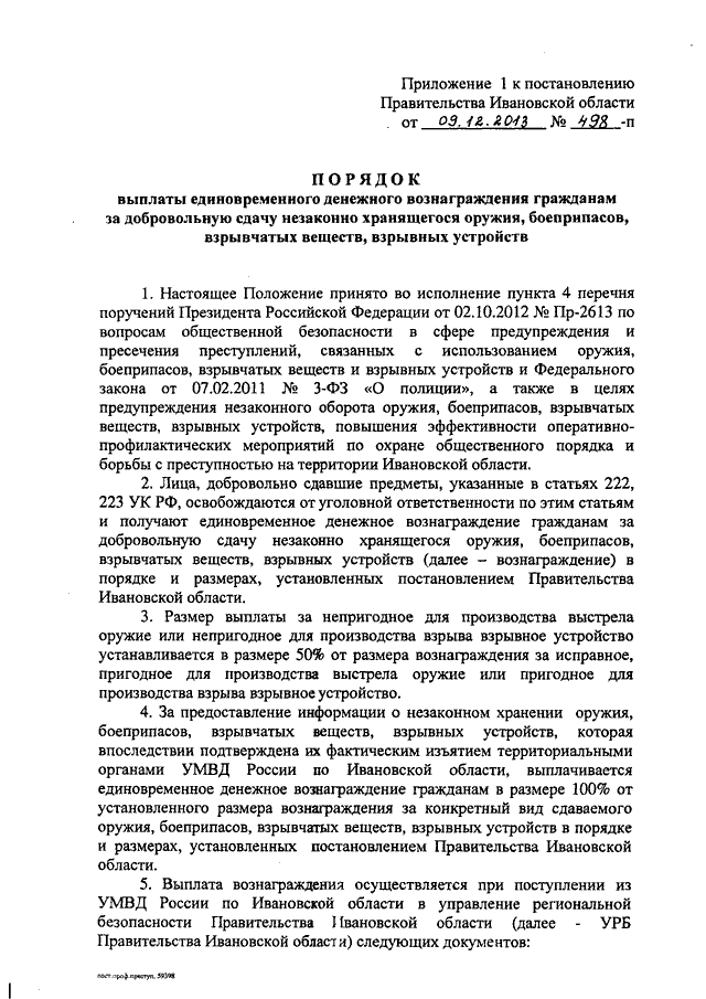 Постановление Правительства Ивановской области от 09.12.2013 N 498-п "О мерах по профилактике правонарушений, борьбе с преступностью и обеспечению безопасности граждан на территории Ивановской области" (вместе с "Порядком выплаты единовременного денежного вознаграждения гражданам за добровольную сдачу незаконно хранящегося оружия, боеприпасов, взрывчатых веществ, взрывных устройств", "Порядком поощрения граждан за участие в охране общественного порядка и за предоставление информации о совершенном или готовящемся тяжком или особо тяжком преступлении")