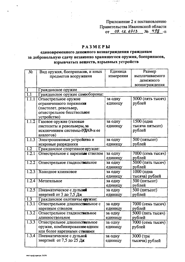 Постановление Правительства Ивановской области от 09.12.2013 N 498-п "О мерах по профилактике правонарушений, борьбе с преступностью и обеспечению безопасности граждан на территории Ивановской области" (вместе с "Порядком выплаты единовременного денежного вознаграждения гражданам за добровольную сдачу незаконно хранящегося оружия, боеприпасов, взрывчатых веществ, взрывных устройств", "Порядком поощрения граждан за участие в охране общественного порядка и за предоставление информации о совершенном или готовящемся тяжком или особо тяжком преступлении")