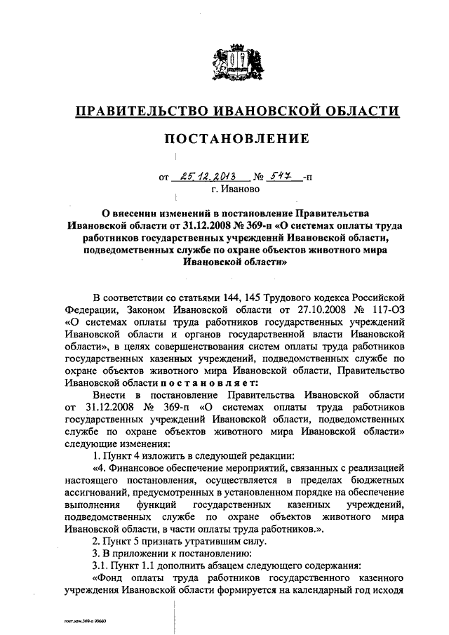 Постановление Правительства Ивановской области от 25.12.2013 N 547-п "О внесении изменений в постановление Правительства Ивановской области от 31.12.2008 N 369-п "О системах оплаты труда работников государственных учреждений Ивановской области, подведомственных службе по охране объектов животного мира Ивановской области"