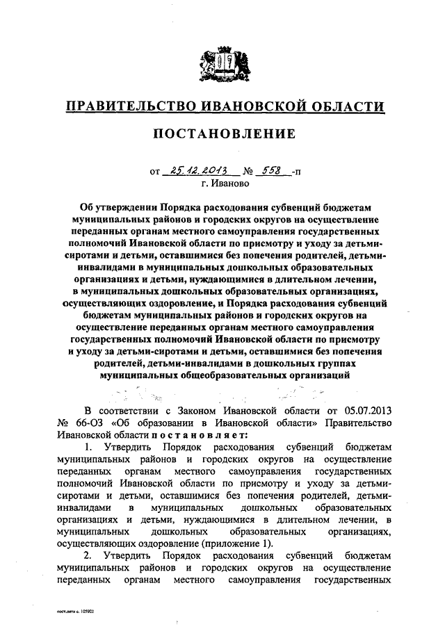 Постановление Правительства Ивановской области от 25.12.2013 N 558-п "Об утверждении Порядка расходования субвенций бюджетам муниципальных районов и городских округов на осуществление переданных органам местного самоуправления государственных полномочий Ивановской области по присмотру и уходу за детьми-сиротами и детьми, оставшимися без попечения родителей, детьми-инвалидами в муниципальных дошкольных образовательных организациях и детьми, нуждающимися в длительном лечении, в муниципальных дошкольных образовательных организациях, осуществляющих оздоровление, и Порядка расходования субвенций бюджетам муниципальных районов и городских округов на осуществление переданных органам местного самоуправления государственных полномочий Ивановской области по присмотру и уходу за детьми-сиротами и детьми, оставшимися без попечения родителей, детьми-инвалидами в дошкольных группах муниципальных общеобразовательных организаций"