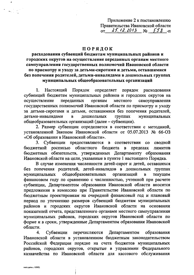 Постановление Правительства Ивановской области от 25.12.2013 N 558-п "Об утверждении Порядка расходования субвенций бюджетам муниципальных районов и городских округов на осуществление переданных органам местного самоуправления государственных полномочий Ивановской области по присмотру и уходу за детьми-сиротами и детьми, оставшимися без попечения родителей, детьми-инвалидами в муниципальных дошкольных образовательных организациях и детьми, нуждающимися в длительном лечении, в муниципальных дошкольных образовательных организациях, осуществляющих оздоровление, и Порядка расходования субвенций бюджетам муниципальных районов и городских округов на осуществление переданных органам местного самоуправления государственных полномочий Ивановской области по присмотру и уходу за детьми-сиротами и детьми, оставшимися без попечения родителей, детьми-инвалидами в дошкольных группах муниципальных общеобразовательных организаций"
