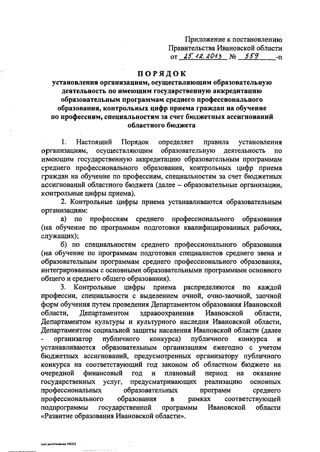 Постановление Правительства Ивановской области от 25.12.2013 N 559-п "Об утверждении Порядка установления организациям, осуществляющим образовательную деятельность по имеющим государственную аккредитацию образовательным программам среднего профессионального образования, контрольных цифр приема граждан на обучение по профессиям, специальностям за счет бюджетных ассигнований областного бюджета"