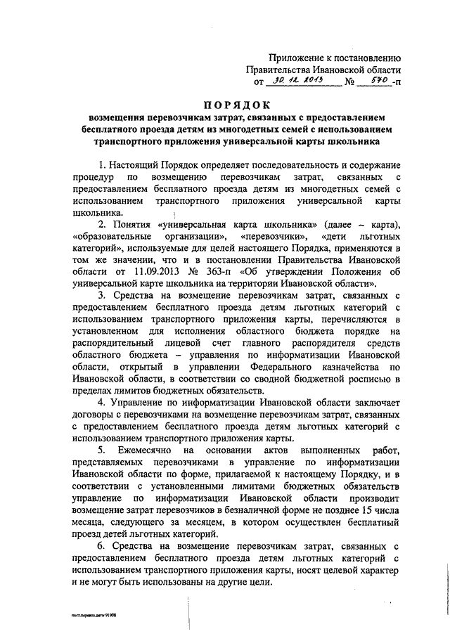 Постановление Правительства Ивановской области от 30.12.2013 N 570-п "Об утверждении Порядка возмещения перевозчикам затрат, связанных с предоставлением бесплатного проезда детям из многодетных семей с использованием транспортного приложения универсальной карты школьника"