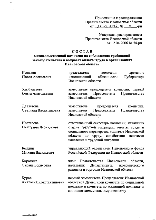 Распоряжение Правительства Ивановской области от 21.01.2014 N 4-рп "О внесении изменения в распоряжение Правительства Ивановской области от 12.04.2006 N 54-рп "Об утверждении состава межведомственной комиссии по соблюдению требований законодательства в вопросах оплаты труда в организациях Ивановской области"