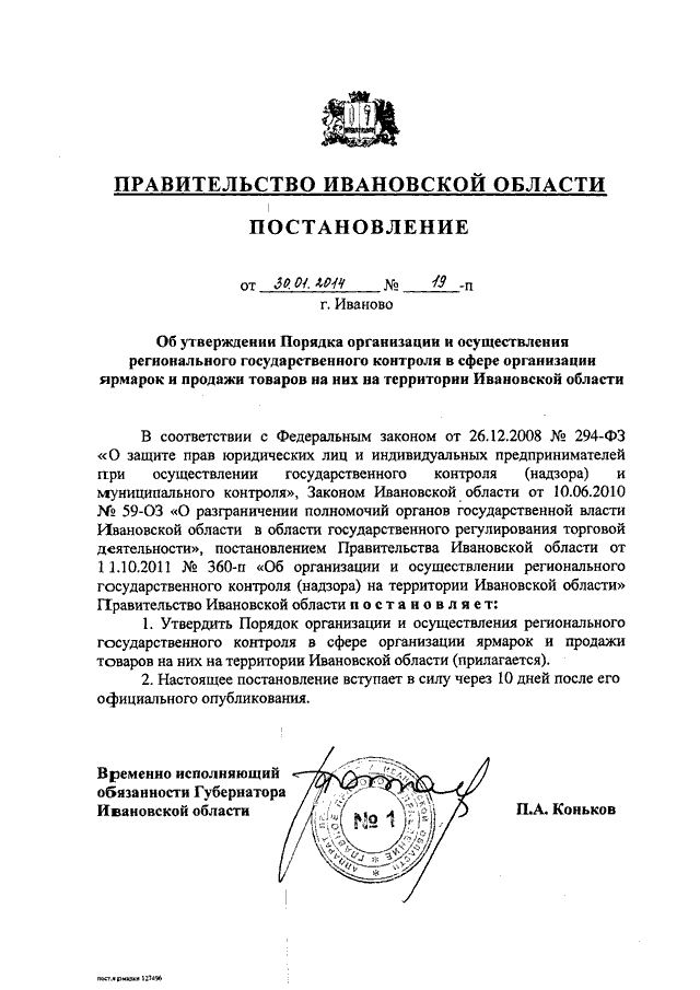 Постановление Правительства Ивановской области от 30.01.2014 N 19-п "Об утверждении Порядка организации и осуществления регионального государственного контроля в сфере организации ярмарок и продажи товаров на них на территории Ивановской области"