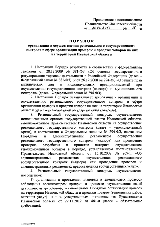 Постановление Правительства Ивановской области от 30.01.2014 N 19-п "Об утверждении Порядка организации и осуществления регионального государственного контроля в сфере организации ярмарок и продажи товаров на них на территории Ивановской области"