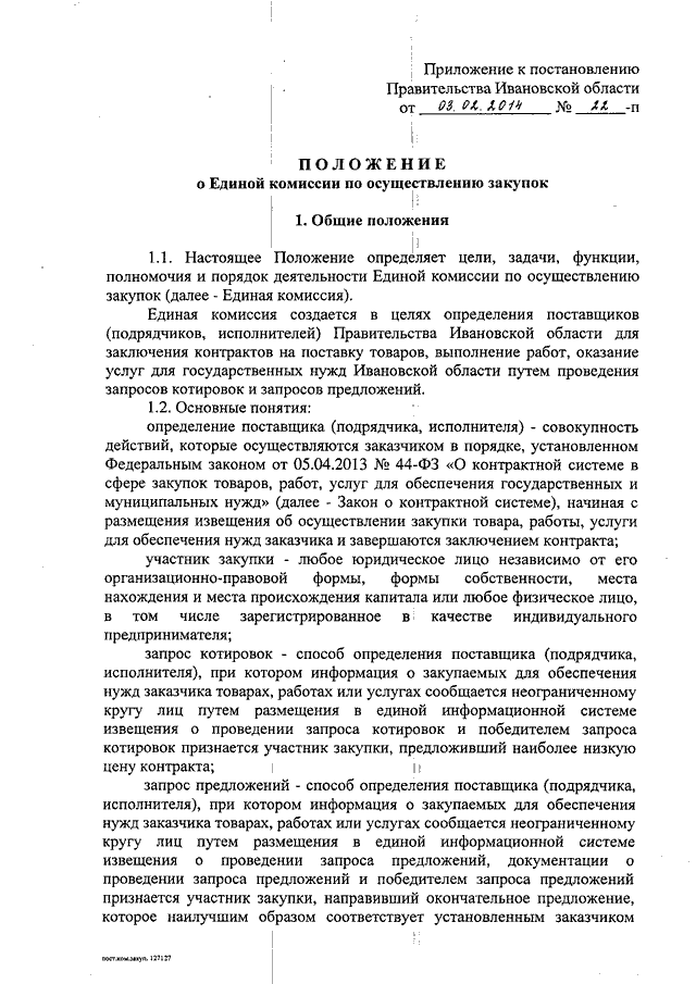 Постановление Правительства Ивановской области от 03.02.2014 N 22-п "О Единой комиссии по осуществлению закупок" (вместе с "Положением о Единой комиссии по осуществлению закупок")