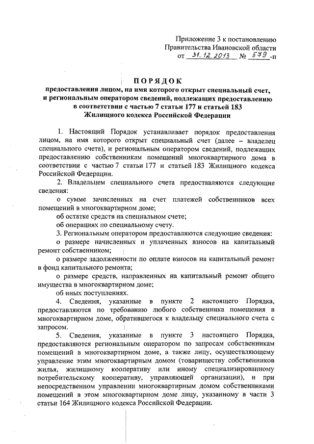 Постановление Правительства Ивановской области от 31.12.2013 N 579-п "Об утверждении порядков, регулирующих отношения в сфере обеспечения проведения капитального ремонта общего имущества в многоквартирных домах, расположенных на территории Ивановской области" (вместе с "Порядком проведения мониторинга технического состояния многоквартирных домов, расположенных на территории Ивановской области", "Порядком и условиями предоставления государственной поддержки на проведение капитального ремонта общего имущества в многоквартирных домах", "Порядком предоставления лицом, на имя которого открыт специальный счет, и региональным оператором сведений, подлежащих предоставлению в соответствии с частью 7 статьи 177 и статьей 183 Жилищного кодекса Российской Федерации", "Порядком выплаты владельцем специального счета и (или) региональным оператором средств фонда капитального ремонта общего имущества в многоквартирном доме собственникам помещений в многоквартирном доме и использования средств фонда капитального ремонта на цели сноса или реконструкции многоквартирного дома в случаях, предусмотренных Жилищным кодексом Российской Федерации", "Порядком осуществления контроля за целевым расходованием денежных средств, сформированных за счет взносов на капитальный ремонт общего имущества в многоквартирном доме, и обеспечением сохранности этих средств", "Порядком утверждения краткосрочных (сроком до трех лет) планов реализации региональной программы капитального ремонта общего имущества в многоквартирных домах", "Порядком принятия решения о проведении аудита годовой бухгалтерской (финансовой) отчетности регионального оператора, утверждения договора с аудиторской организацией (аудитором), размещения на сайте в информационно-телекоммуникационной сети Интернет годового отчета регионального оператора и аудиторского заключения")