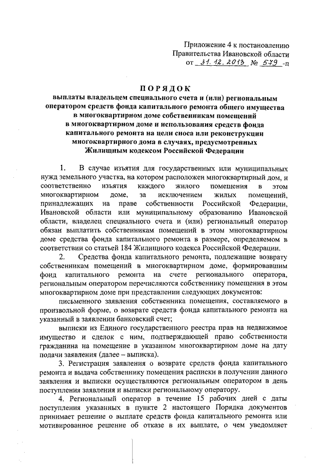 Постановление Правительства Ивановской области от 31.12.2013 N 579-п "Об утверждении порядков, регулирующих отношения в сфере обеспечения проведения капитального ремонта общего имущества в многоквартирных домах, расположенных на территории Ивановской области" (вместе с "Порядком проведения мониторинга технического состояния многоквартирных домов, расположенных на территории Ивановской области", "Порядком и условиями предоставления государственной поддержки на проведение капитального ремонта общего имущества в многоквартирных домах", "Порядком предоставления лицом, на имя которого открыт специальный счет, и региональным оператором сведений, подлежащих предоставлению в соответствии с частью 7 статьи 177 и статьей 183 Жилищного кодекса Российской Федерации", "Порядком выплаты владельцем специального счета и (или) региональным оператором средств фонда капитального ремонта общего имущества в многоквартирном доме собственникам помещений в многоквартирном доме и использования средств фонда капитального ремонта на цели сноса или реконструкции многоквартирного дома в случаях, предусмотренных Жилищным кодексом Российской Федерации", "Порядком осуществления контроля за целевым расходованием денежных средств, сформированных за счет взносов на капитальный ремонт общего имущества в многоквартирном доме, и обеспечением сохранности этих средств", "Порядком утверждения краткосрочных (сроком до трех лет) планов реализации региональной программы капитального ремонта общего имущества в многоквартирных домах", "Порядком принятия решения о проведении аудита годовой бухгалтерской (финансовой) отчетности регионального оператора, утверждения договора с аудиторской организацией (аудитором), размещения на сайте в информационно-телекоммуникационной сети Интернет годового отчета регионального оператора и аудиторского заключения")