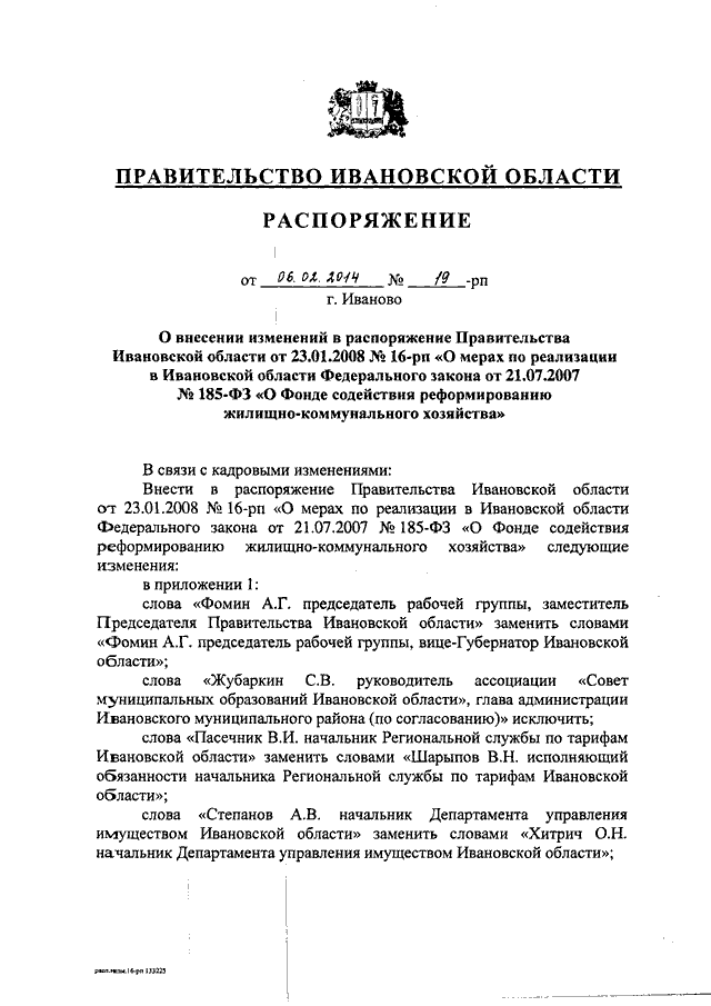 Распоряжение Правительства Ивановской области от 06.02.2014 N 19-рп "О внесении изменений в распоряжение Правительства Ивановской области от 23.01.2008 N 16-рп "О мерах по реализации в Ивановской области Федерального закона от 21.07.2007 N 185-ФЗ "О Фонде содействия реформированию жилищно-коммунального хозяйства"