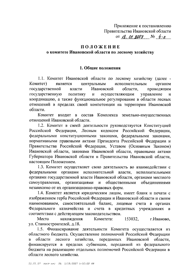 Постановление Правительства Ивановской области от 18.01.2007 N 4-п "О создании комитета Ивановской области по лесному хозяйству" (вместе с "Положением о комитете Ивановской области по лесному хозяйству")