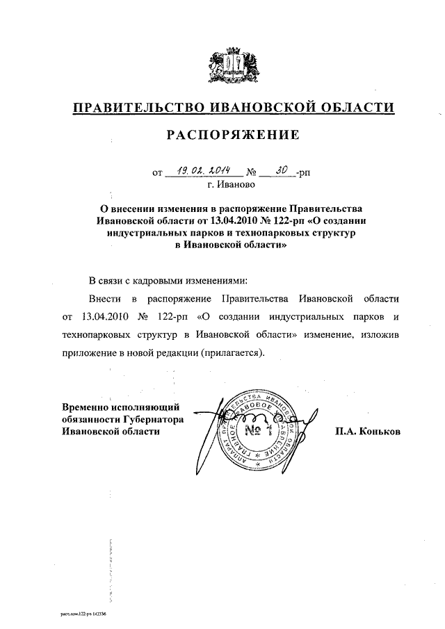Распоряжение Правительства Ивановской области от 19.02.2014 N 30-рп "О внесении изменения в распоряжение Правительства Ивановской области от 13.04.2010 N 122-рп "О создании индустриальных парков и технопарковых структур в Ивановской области"