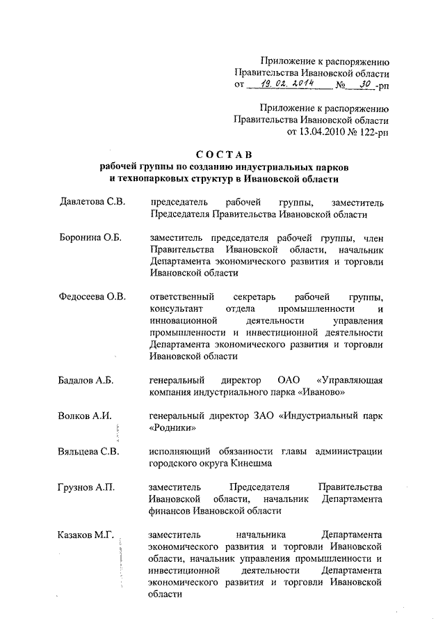 Распоряжение Правительства Ивановской области от 19.02.2014 N 30-рп "О внесении изменения в распоряжение Правительства Ивановской области от 13.04.2010 N 122-рп "О создании индустриальных парков и технопарковых структур в Ивановской области"