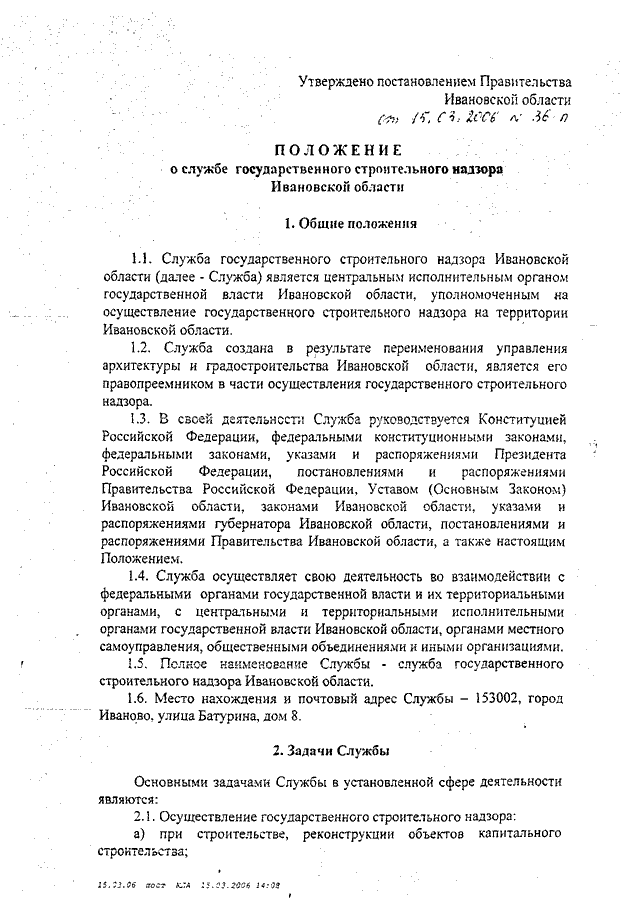 Постановление Правительства Ивановской области от 15.03.2006 N 36-п "Об утверждении Положения о службе государственного строительного надзора Ивановской области"