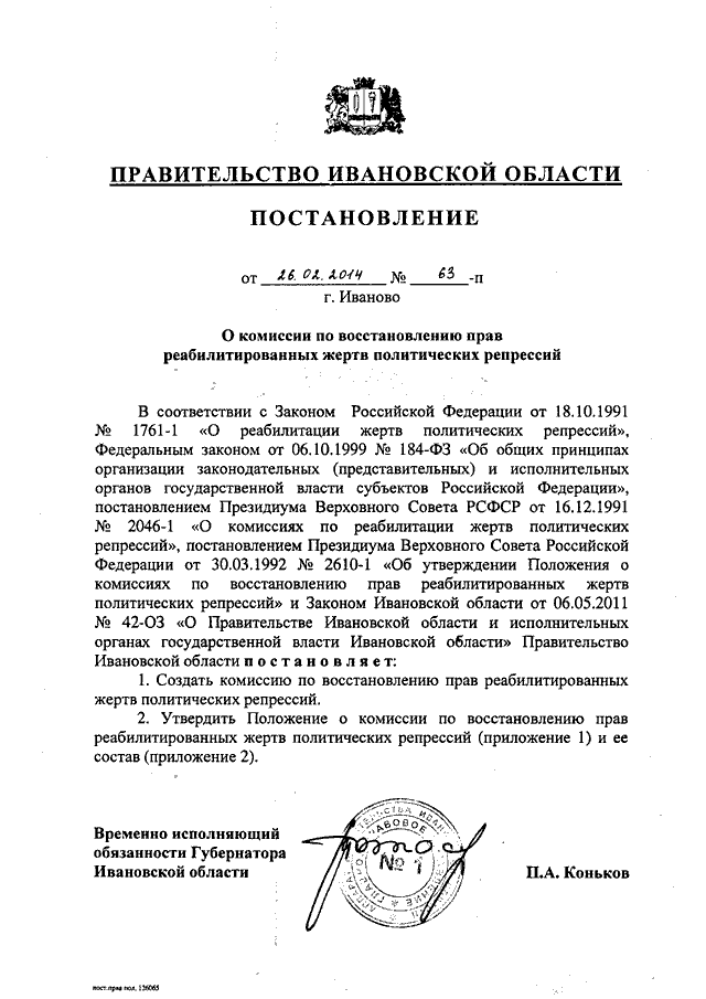 Постановление Правительства Ивановской области от 26.02.2014 N 63-п "О комиссии по восстановлению прав реабилитированных жертв политических репрессий" (вместе с "Положением о комиссии по восстановлению прав реабилитированных жертв политических репрессий")