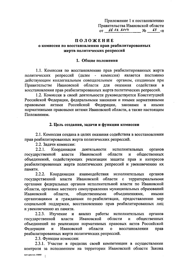 Постановление Правительства Ивановской области от 26.02.2014 N 63-п "О комиссии по восстановлению прав реабилитированных жертв политических репрессий" (вместе с "Положением о комиссии по восстановлению прав реабилитированных жертв политических репрессий")