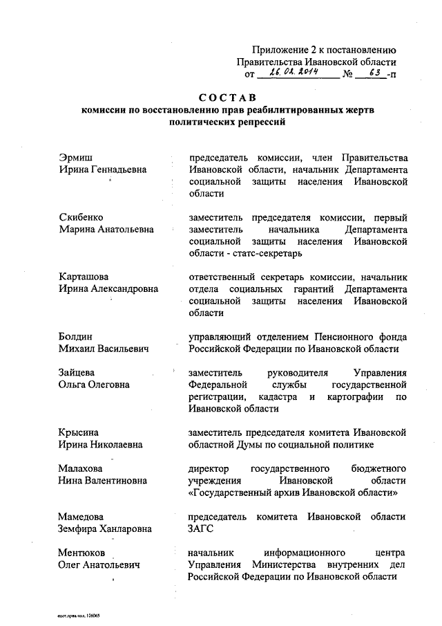 Постановление Правительства Ивановской области от 26.02.2014 N 63-п "О комиссии по восстановлению прав реабилитированных жертв политических репрессий" (вместе с "Положением о комиссии по восстановлению прав реабилитированных жертв политических репрессий")