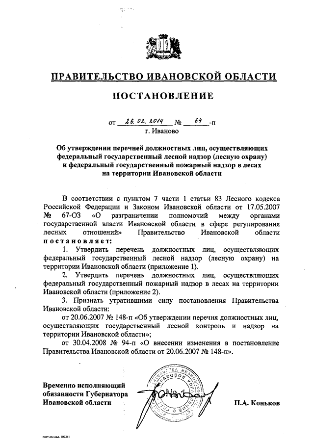 Постановление Правительства Ивановской области от 26.02.2014 N 64-п "Об утверждении перечней должностных лиц, осуществляющих федеральный государственный лесной надзор (лесную охрану) и федеральный государственный пожарный надзор в лесах на территории Ивановской области"