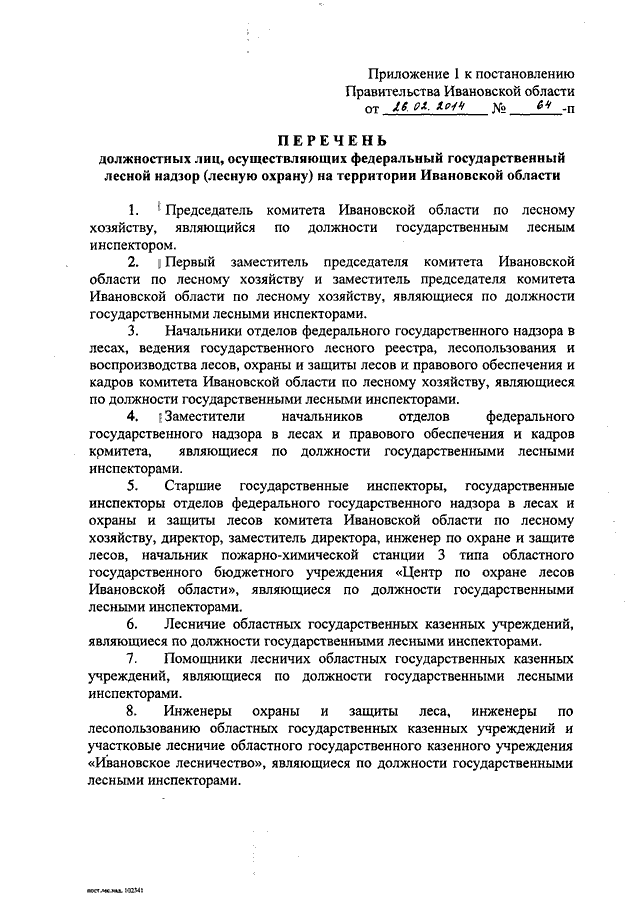 Постановление Правительства Ивановской области от 26.02.2014 N 64-п "Об утверждении перечней должностных лиц, осуществляющих федеральный государственный лесной надзор (лесную охрану) и федеральный государственный пожарный надзор в лесах на территории Ивановской области"