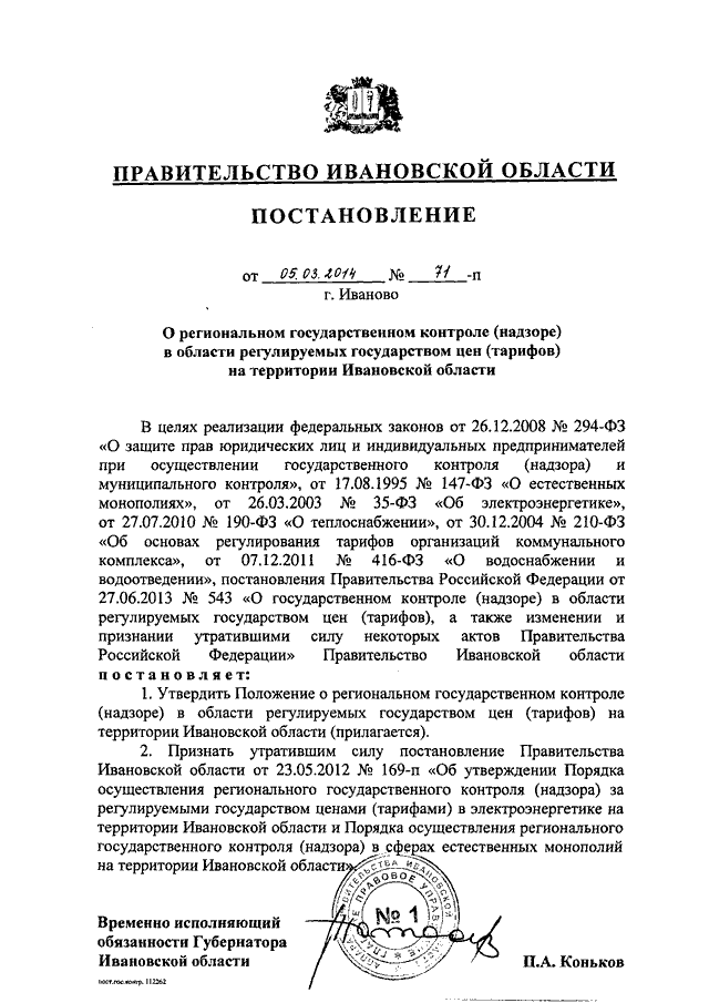 Постановление Правительства Ивановской области от 05.03.2014 N 71-п "О региональном государственном контроле (надзоре) в области регулируемых государством цен (тарифов) на территории Ивановской области" (вместе с "Положением о региональном государственном контроле (надзоре) в области регулируемых государством цен (тарифов) на территории Ивановской области")