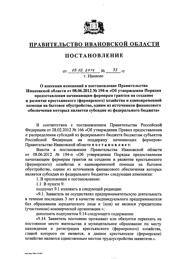Постановление Правительства Ивановской области от 05.03.2014 N 73-п "О внесении изменений в постановление Правительства Ивановской области от 08.06.2012 N 194-п "Об утверждении Порядка предоставления начинающим фермерам грантов на создание и развитие крестьянского (фермерского) хозяйства и единовременной помощи на бытовое обустройство, одним из источников финансового обеспечения которых является субсидия из федерального бюджета"