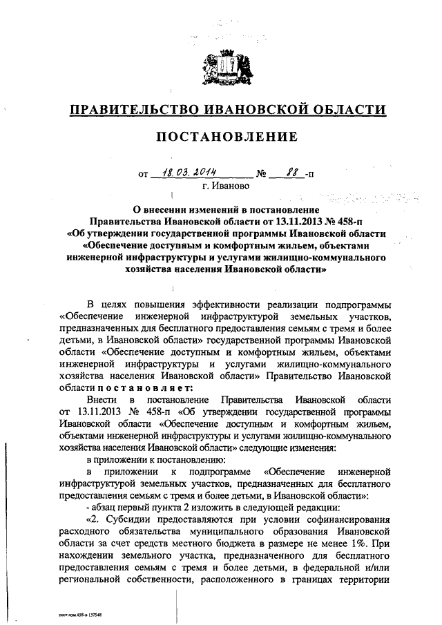 Постановление Правительства Ивановской области от 18.03.2014 N 88-п "О внесении изменений в постановление Правительства Ивановской области от 13.11.2013 N 458-п "Об утверждении государственной программы Ивановской области "Обеспечение доступным и комфортным жильем, объектами инженерной инфраструктуры и услугами жилищно-коммунального хозяйства населения Ивановской области"