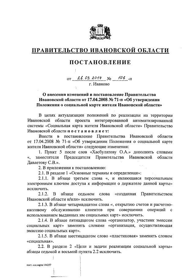 Постановление Правительства Ивановской области от 26.03.2014 N 106-п "О внесении изменений в постановление Правительства Ивановской области от 17.04.2008 N 71-п "Об утверждении Положения о социальной карте жителя Ивановской области"