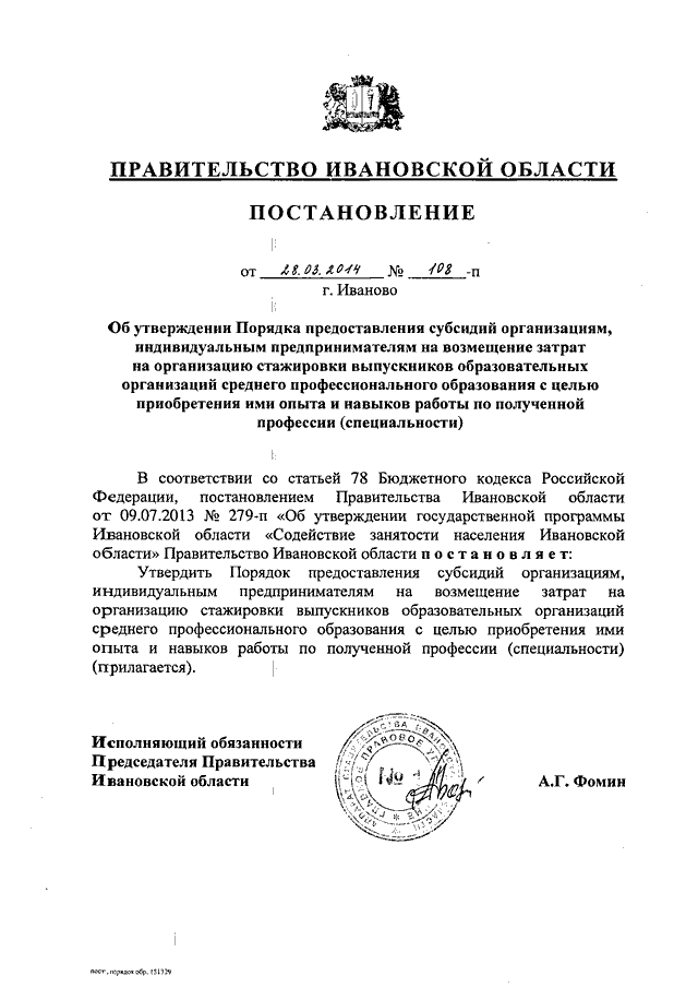 Постановление Правительства Ивановской области от 28.03.2014 N 108-п "Об утверждении Порядка предоставления субсидий организациям, индивидуальным предпринимателям на возмещение затрат на организацию стажировки выпускников образовательных организаций среднего профессионального образования с целью приобретения ими опыта и навыков работы по полученной профессии (специальности)"