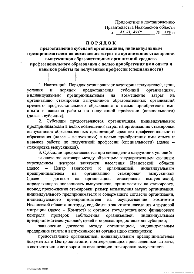 Постановление Правительства Ивановской области от 28.03.2014 N 108-п "Об утверждении Порядка предоставления субсидий организациям, индивидуальным предпринимателям на возмещение затрат на организацию стажировки выпускников образовательных организаций среднего профессионального образования с целью приобретения ими опыта и навыков работы по полученной профессии (специальности)"