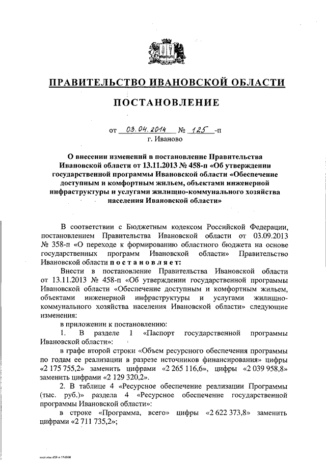 Постановление Правительства Ивановской области от 03.04.2014 N 125-п "О внесении изменений в постановление Правительства Ивановской области от 13.11.2013 N 458-п "Об утверждении государственной программы Ивановской области "Обеспечение доступным и комфортным жильем, объектами инженерной инфраструктуры и услугами жилищно-коммунального хозяйства населения Ивановской области"