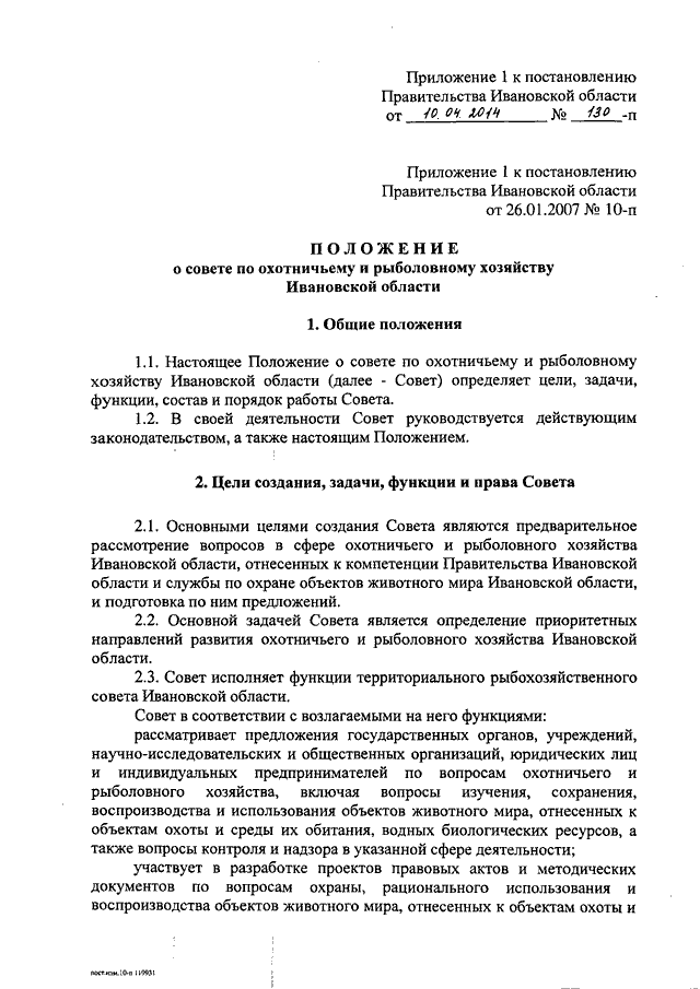 Постановление Правительства Ивановской области от 10.04.2014 N 130-п "О внесении изменений в постановление Правительства Ивановской области от 26.01.2007 N 10-п "О совете по охотничьему и рыболовному хозяйству Ивановской области" (вместе с "Положением о совете по охотничьему и рыболовному хозяйству Ивановской области")