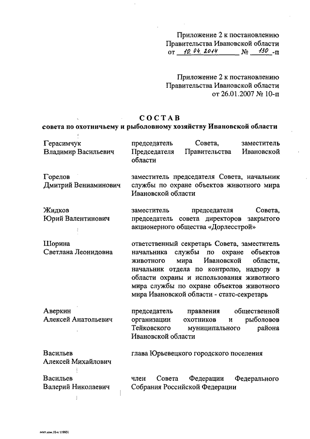 Постановление Правительства Ивановской области от 10.04.2014 N 130-п "О внесении изменений в постановление Правительства Ивановской области от 26.01.2007 N 10-п "О совете по охотничьему и рыболовному хозяйству Ивановской области" (вместе с "Положением о совете по охотничьему и рыболовному хозяйству Ивановской области")
