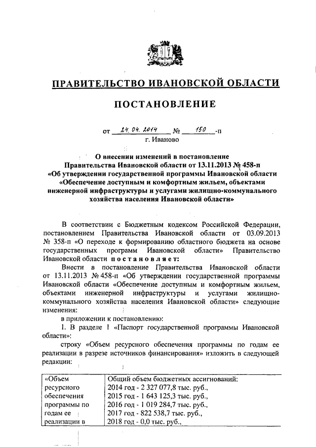 Постановление Правительства Ивановской области от 24.04.2014 N 150-п "О внесении изменений в постановление Правительства Ивановской области от 13.11.2013 N 458-п "Об утверждении государственной программы Ивановской области "Обеспечение доступным и комфортным жильем, объектами инженерной инфраструктуры и услугами жилищно-коммунального хозяйства населения Ивановской области" (вместе с "Подпрограммой "Переселение граждан из аварийного жилищного фонда на территории Ивановской области")