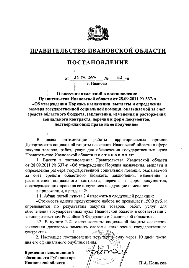 Постановление Правительства Ивановской области от 24.04.2014 N 153-п "О внесении изменений в постановление Правительства Ивановской области от 28.09.2011 N 337-п "Об утверждении Порядка назначения, выплаты и определения размера государственной социальной помощи, оказываемой за счет средств областного бюджета, заключения, изменения и расторжения социального контракта, перечня и форм документов, подтверждающих право на ее получение"