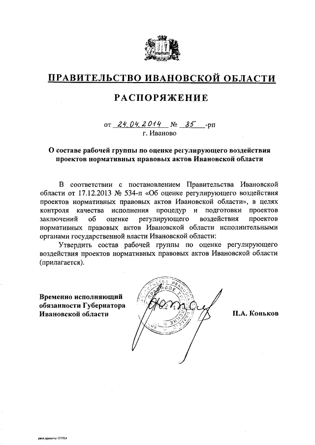 Распоряжение Правительства Ивановской области от 24.04.2014 N 85-рп "О составе рабочей группы по оценке регулирующего воздействия проектов нормативных правовых актов Ивановской области"