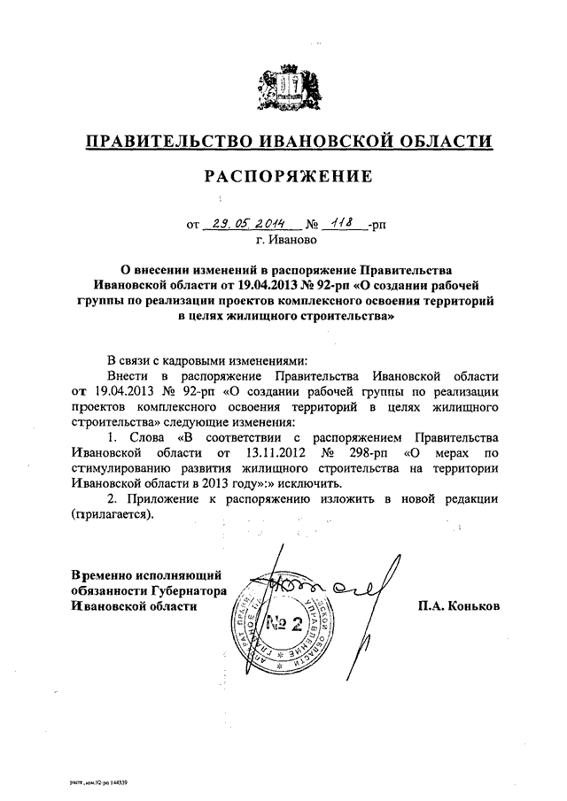 Распоряжение Правительства Ивановской области от 29.05.2014 N 118-рп "О внесении изменений в распоряжение Правительства Ивановской области от 19.04.2013 N 92-рп "О создании рабочей группы по реализации проектов комплексного освоения территорий в целях жилищного строительства"