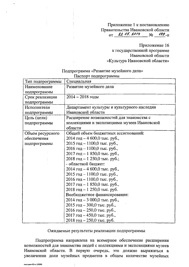 Постановление Правительства Ивановской области от 28.05.2014 N 199-п "О внесении изменений в постановление Правительства Ивановской области от 13.11.2013 N 453-п "Об утверждении государственной программы Ивановской области "Культура Ивановской области" (вместе с "Подпрограммой "Развитие музейного дела", "Подпрограммой "К культуре через культурный досуг")