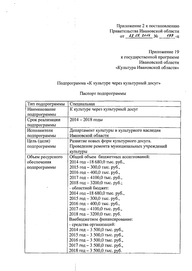 Постановление Правительства Ивановской области от 28.05.2014 N 199-п "О внесении изменений в постановление Правительства Ивановской области от 13.11.2013 N 453-п "Об утверждении государственной программы Ивановской области "Культура Ивановской области" (вместе с "Подпрограммой "Развитие музейного дела", "Подпрограммой "К культуре через культурный досуг")