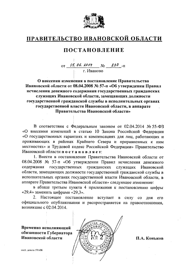 Постановление Правительства Ивановской области от 05.06.2014 N 230-п "О внесении изменения в постановление Правительства Ивановской области от 08.04.2008 N 57-п "Об утверждении Правил исчисления денежного содержания государственных гражданских служащих Ивановской области, замещающих должности государственной гражданской службы в исполнительных органах государственной власти Ивановской области, в аппарате Правительства Ивановской области"