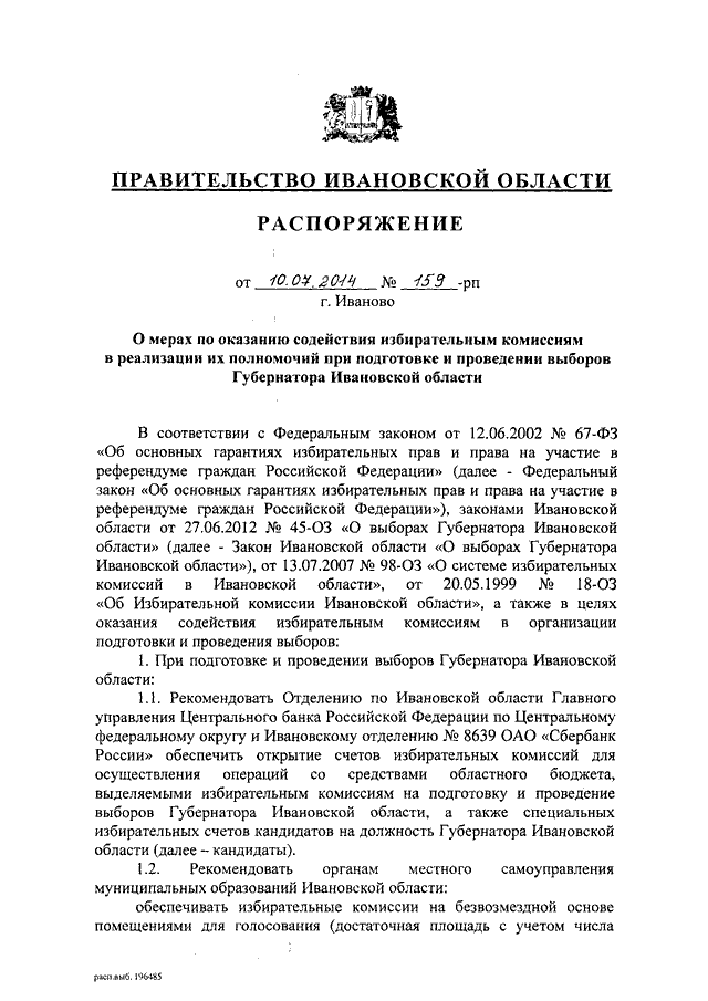 Распоряжение Правительства Ивановской области от 10.07.2014 N 159-рп "О мерах по оказанию содействия избирательным комиссиям в реализации их полномочий при подготовке и проведении выборов Губернатора Ивановской области"