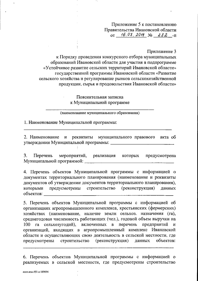 Постановление Правительства Ивановской области от 16.07.2014 N 282-п "О внесении изменений в постановление Правительства Ивановской области от 13.11.2013 N 451-п "Об утверждении государственной программы Ивановской области "Развитие сельского хозяйства и регулирование рынков сельскохозяйственной продукции, сырья и продовольствия Ивановской области" (вместе с "Порядком проведения конкурсного отбора муниципальных образований Ивановской области для участия в подпрограмме "Устойчивое развитие сельских территорий Ивановской области" государственной программы Ивановской области "Развитие сельского хозяйства и регулирование рынков сельскохозяйственной продукции, сырья и продовольствия Ивановской области", "Порядком предоставления и расходования субсидий из бюджета Ивановской области бюджетам муниципальных образований Ивановской области на софинансирование расходных обязательств муниципальных образований по строительству (приобретению) жилья, предоставляемого молодым семьям, молодым специалистам по договору найма жилого помещения", "Порядком предоставления и расходования субсидий из бюджета Ивановской области бюджетам муниципальных образований Ивановской области на комплексное обустройство объектами социальной и инженерной инфраструктуры населенных пунктов, расположенных в сельской местности", "Порядком предоставления и расходования субсидий из бюджета Ивановской области бюджетам муниципальных образований Ивановской области на грантовую поддержку местных инициатив граждан, проживающих в сельской местности")