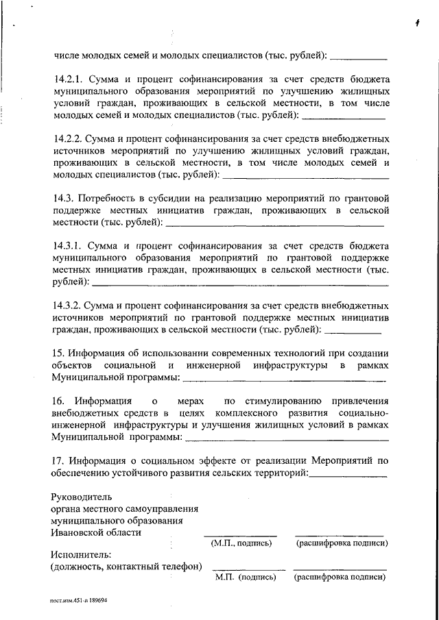 Постановление Правительства Ивановской области от 16.07.2014 N 282-п "О внесении изменений в постановление Правительства Ивановской области от 13.11.2013 N 451-п "Об утверждении государственной программы Ивановской области "Развитие сельского хозяйства и регулирование рынков сельскохозяйственной продукции, сырья и продовольствия Ивановской области" (вместе с "Порядком проведения конкурсного отбора муниципальных образований Ивановской области для участия в подпрограмме "Устойчивое развитие сельских территорий Ивановской области" государственной программы Ивановской области "Развитие сельского хозяйства и регулирование рынков сельскохозяйственной продукции, сырья и продовольствия Ивановской области", "Порядком предоставления и расходования субсидий из бюджета Ивановской области бюджетам муниципальных образований Ивановской области на софинансирование расходных обязательств муниципальных образований по строительству (приобретению) жилья, предоставляемого молодым семьям, молодым специалистам по договору найма жилого помещения", "Порядком предоставления и расходования субсидий из бюджета Ивановской области бюджетам муниципальных образований Ивановской области на комплексное обустройство объектами социальной и инженерной инфраструктуры населенных пунктов, расположенных в сельской местности", "Порядком предоставления и расходования субсидий из бюджета Ивановской области бюджетам муниципальных образований Ивановской области на грантовую поддержку местных инициатив граждан, проживающих в сельской местности")