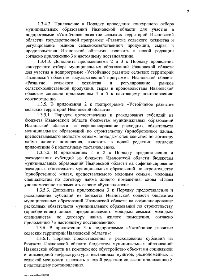 Постановление Правительства Ивановской области от 16.07.2014 N 282-п "О внесении изменений в постановление Правительства Ивановской области от 13.11.2013 N 451-п "Об утверждении государственной программы Ивановской области "Развитие сельского хозяйства и регулирование рынков сельскохозяйственной продукции, сырья и продовольствия Ивановской области" (вместе с "Порядком проведения конкурсного отбора муниципальных образований Ивановской области для участия в подпрограмме "Устойчивое развитие сельских территорий Ивановской области" государственной программы Ивановской области "Развитие сельского хозяйства и регулирование рынков сельскохозяйственной продукции, сырья и продовольствия Ивановской области", "Порядком предоставления и расходования субсидий из бюджета Ивановской области бюджетам муниципальных образований Ивановской области на софинансирование расходных обязательств муниципальных образований по строительству (приобретению) жилья, предоставляемого молодым семьям, молодым специалистам по договору найма жилого помещения", "Порядком предоставления и расходования субсидий из бюджета Ивановской области бюджетам муниципальных образований Ивановской области на комплексное обустройство объектами социальной и инженерной инфраструктуры населенных пунктов, расположенных в сельской местности", "Порядком предоставления и расходования субсидий из бюджета Ивановской области бюджетам муниципальных образований Ивановской области на грантовую поддержку местных инициатив граждан, проживающих в сельской местности")