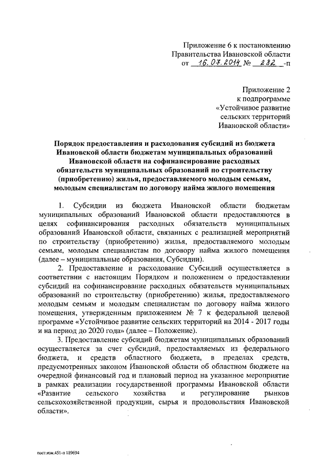 Постановление Правительства Ивановской области от 16.07.2014 N 282-п "О внесении изменений в постановление Правительства Ивановской области от 13.11.2013 N 451-п "Об утверждении государственной программы Ивановской области "Развитие сельского хозяйства и регулирование рынков сельскохозяйственной продукции, сырья и продовольствия Ивановской области" (вместе с "Порядком проведения конкурсного отбора муниципальных образований Ивановской области для участия в подпрограмме "Устойчивое развитие сельских территорий Ивановской области" государственной программы Ивановской области "Развитие сельского хозяйства и регулирование рынков сельскохозяйственной продукции, сырья и продовольствия Ивановской области", "Порядком предоставления и расходования субсидий из бюджета Ивановской области бюджетам муниципальных образований Ивановской области на софинансирование расходных обязательств муниципальных образований по строительству (приобретению) жилья, предоставляемого молодым семьям, молодым специалистам по договору найма жилого помещения", "Порядком предоставления и расходования субсидий из бюджета Ивановской области бюджетам муниципальных образований Ивановской области на комплексное обустройство объектами социальной и инженерной инфраструктуры населенных пунктов, расположенных в сельской местности", "Порядком предоставления и расходования субсидий из бюджета Ивановской области бюджетам муниципальных образований Ивановской области на грантовую поддержку местных инициатив граждан, проживающих в сельской местности")