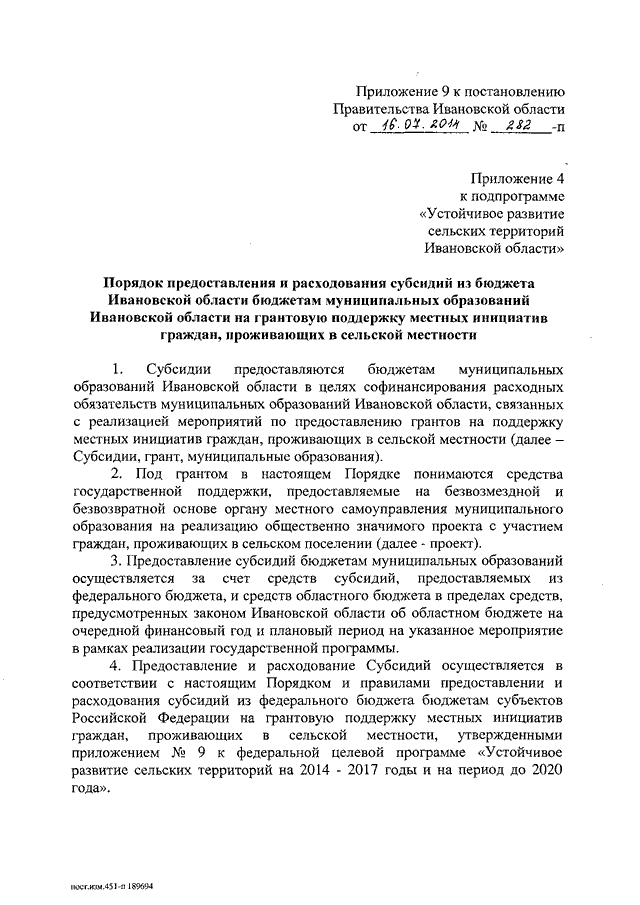 Постановление Правительства Ивановской области от 16.07.2014 N 282-п "О внесении изменений в постановление Правительства Ивановской области от 13.11.2013 N 451-п "Об утверждении государственной программы Ивановской области "Развитие сельского хозяйства и регулирование рынков сельскохозяйственной продукции, сырья и продовольствия Ивановской области" (вместе с "Порядком проведения конкурсного отбора муниципальных образований Ивановской области для участия в подпрограмме "Устойчивое развитие сельских территорий Ивановской области" государственной программы Ивановской области "Развитие сельского хозяйства и регулирование рынков сельскохозяйственной продукции, сырья и продовольствия Ивановской области", "Порядком предоставления и расходования субсидий из бюджета Ивановской области бюджетам муниципальных образований Ивановской области на софинансирование расходных обязательств муниципальных образований по строительству (приобретению) жилья, предоставляемого молодым семьям, молодым специалистам по договору найма жилого помещения", "Порядком предоставления и расходования субсидий из бюджета Ивановской области бюджетам муниципальных образований Ивановской области на комплексное обустройство объектами социальной и инженерной инфраструктуры населенных пунктов, расположенных в сельской местности", "Порядком предоставления и расходования субсидий из бюджета Ивановской области бюджетам муниципальных образований Ивановской области на грантовую поддержку местных инициатив граждан, проживающих в сельской местности")